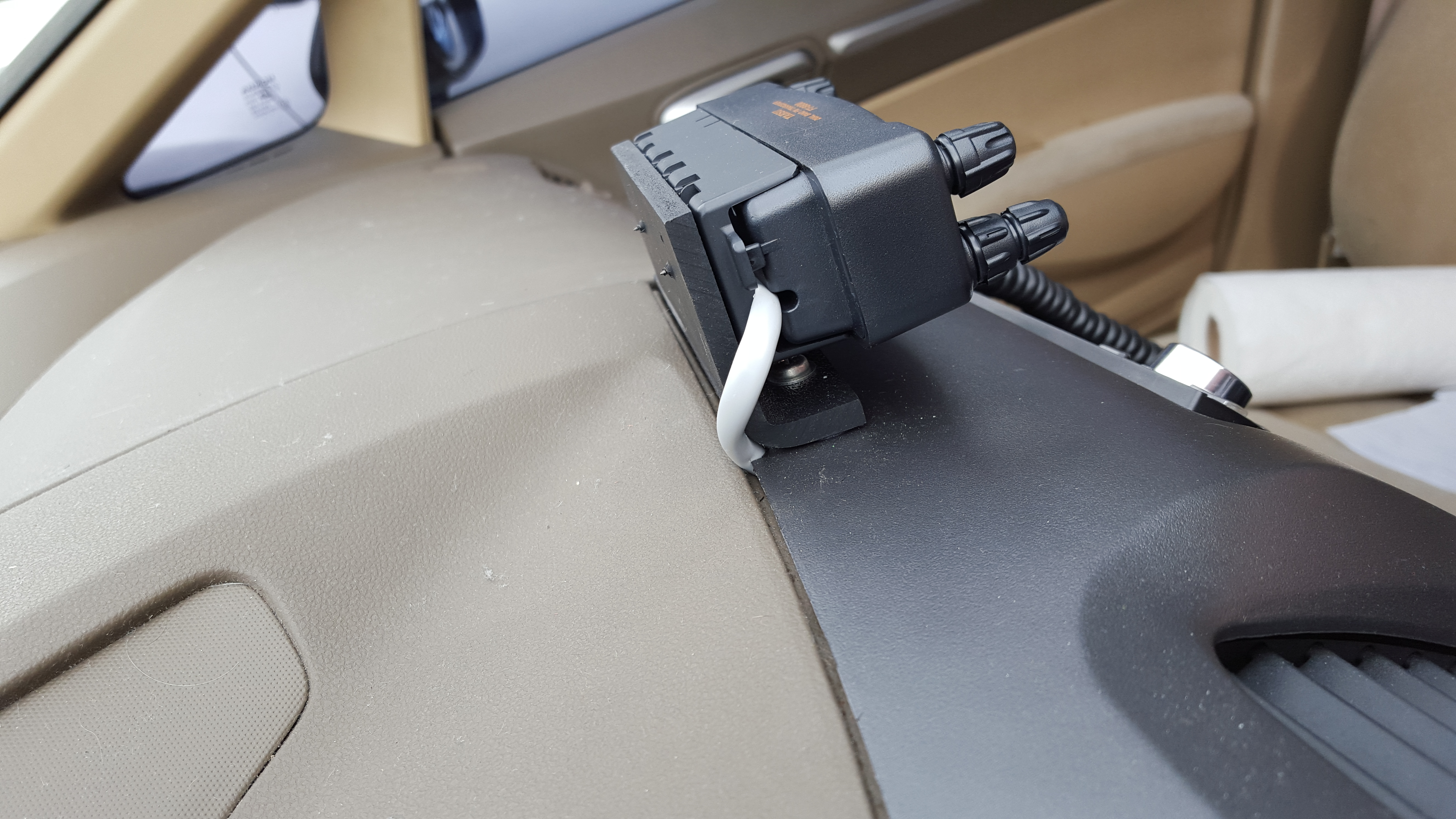 The Yaesu has a remote head unit, that connects to the main body via an RJ-12 cable that I had to route through the body of the car on the inside. Once this was done, I was able to get the remote head unit mounted up on my dash. This puppy isn’t moving anywhere. =)