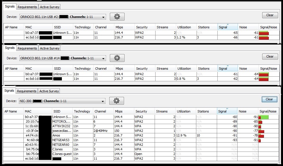 So not only are all three adapters not hearing all of the nearby Access Points the same, but my noise floor is essentially being destroyed.