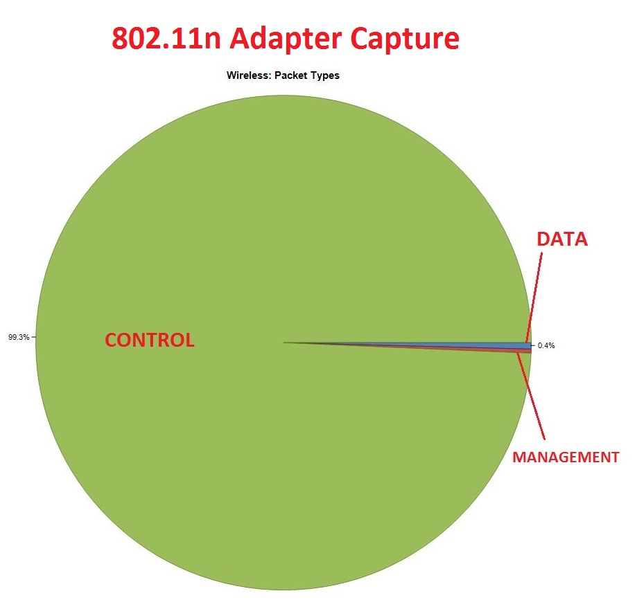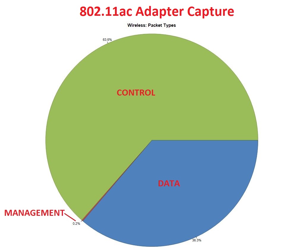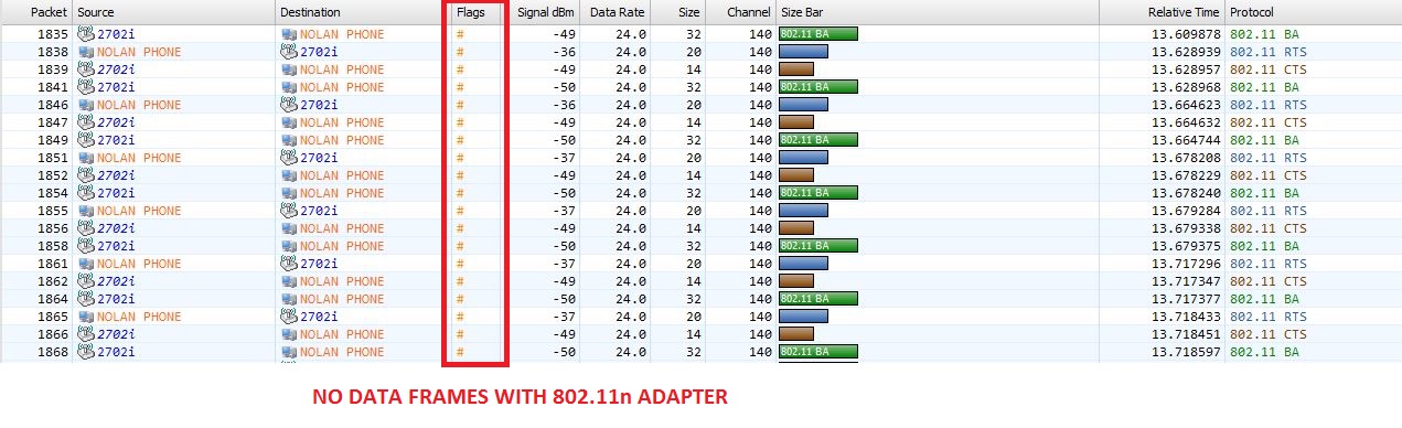Here are several images of the types of frames that each adapter heard. As you can see, an 802.11n adapter simply cannot decode any 802.11ac data frames, which means your out of luck if your trying to accurately determine things like retransmission percent etc.