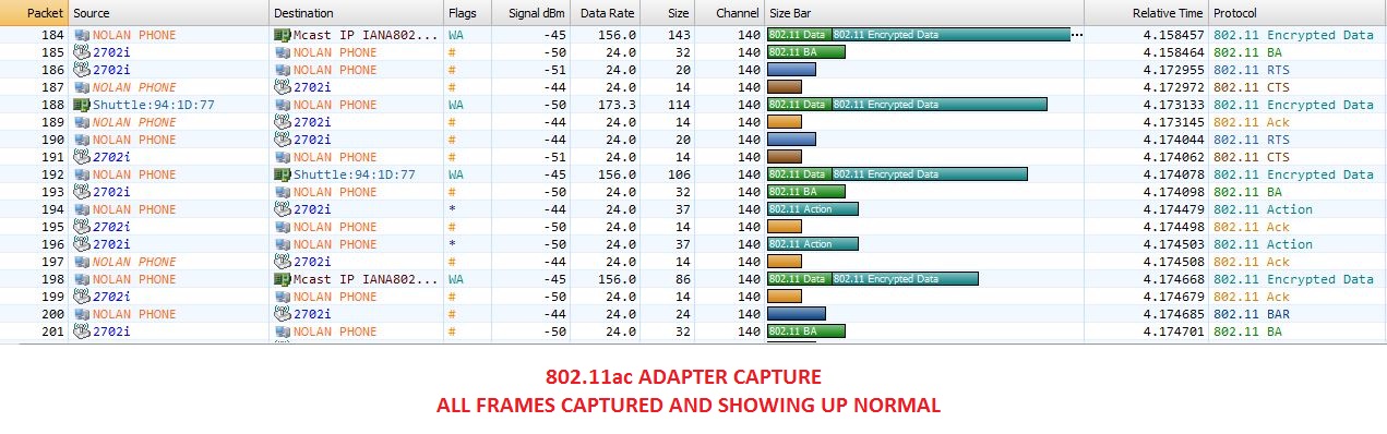 Here is a screenshot of the 802.11ac adapter capturing 802.11ac frames looks like. Everything appears to be normal as it should be.