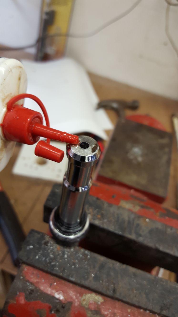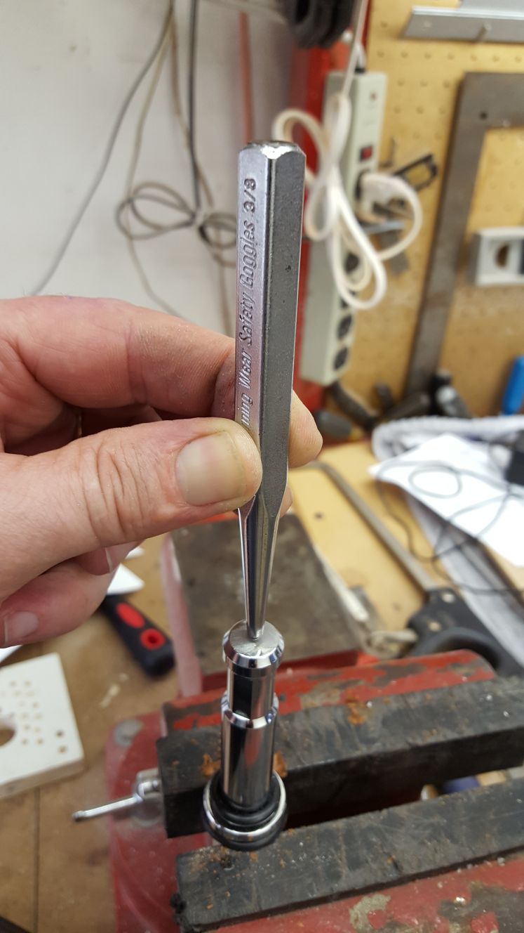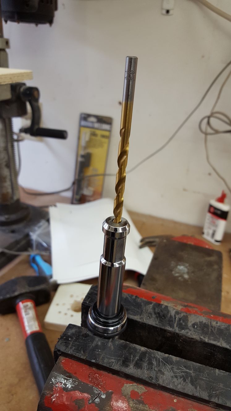 Working with my father in his shop. First you have to file off the chrome on the top of the tip. We then used a center punch to create a small dent in the center of the tip for drilling.