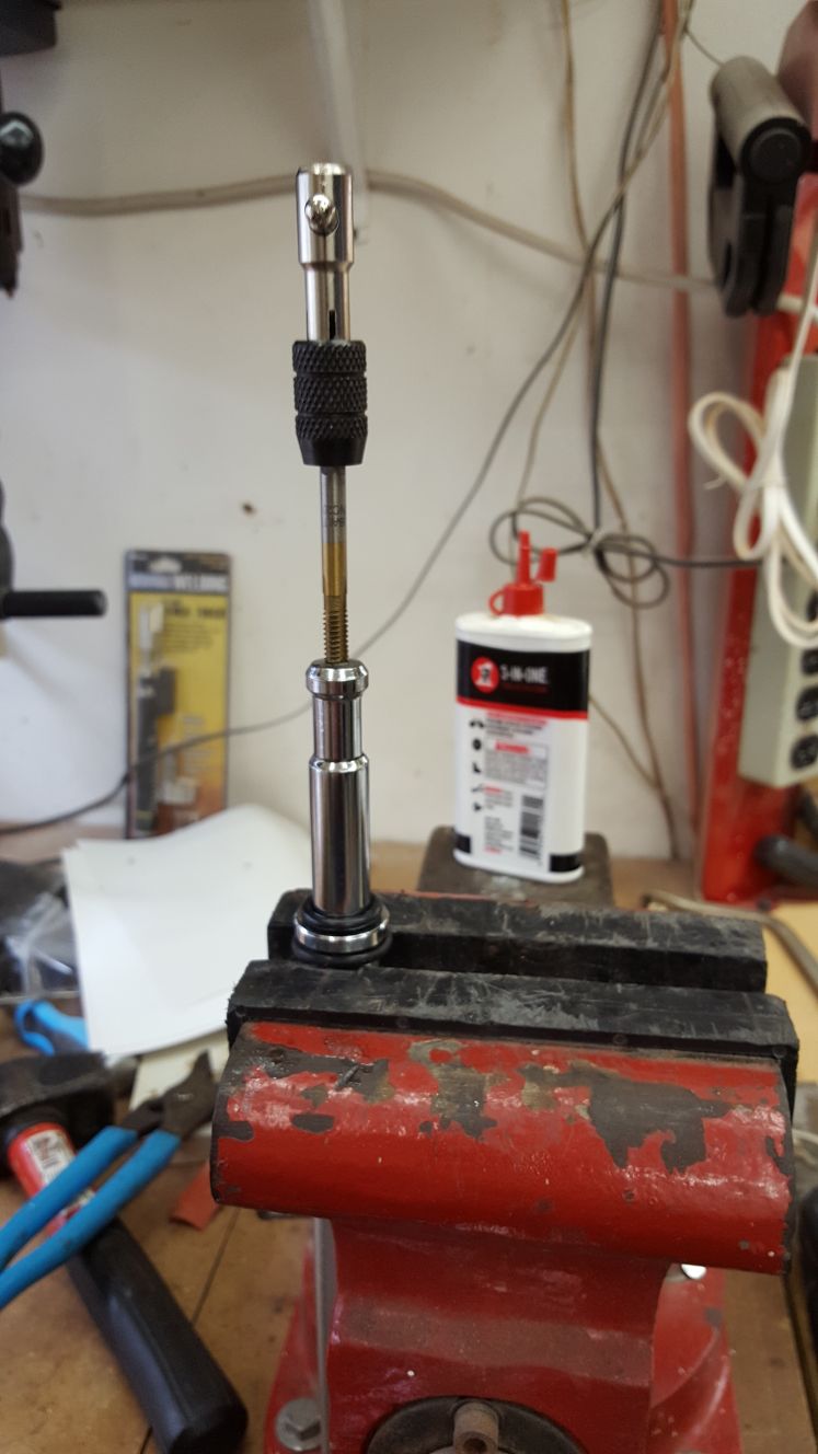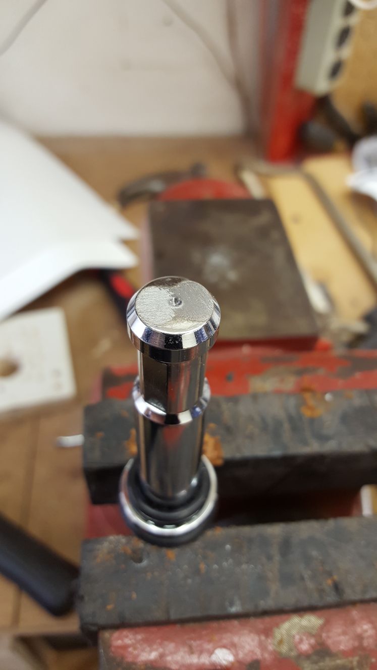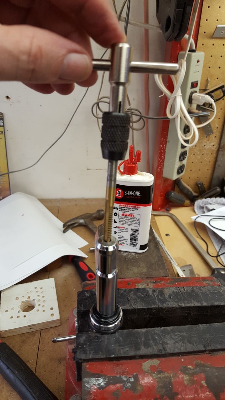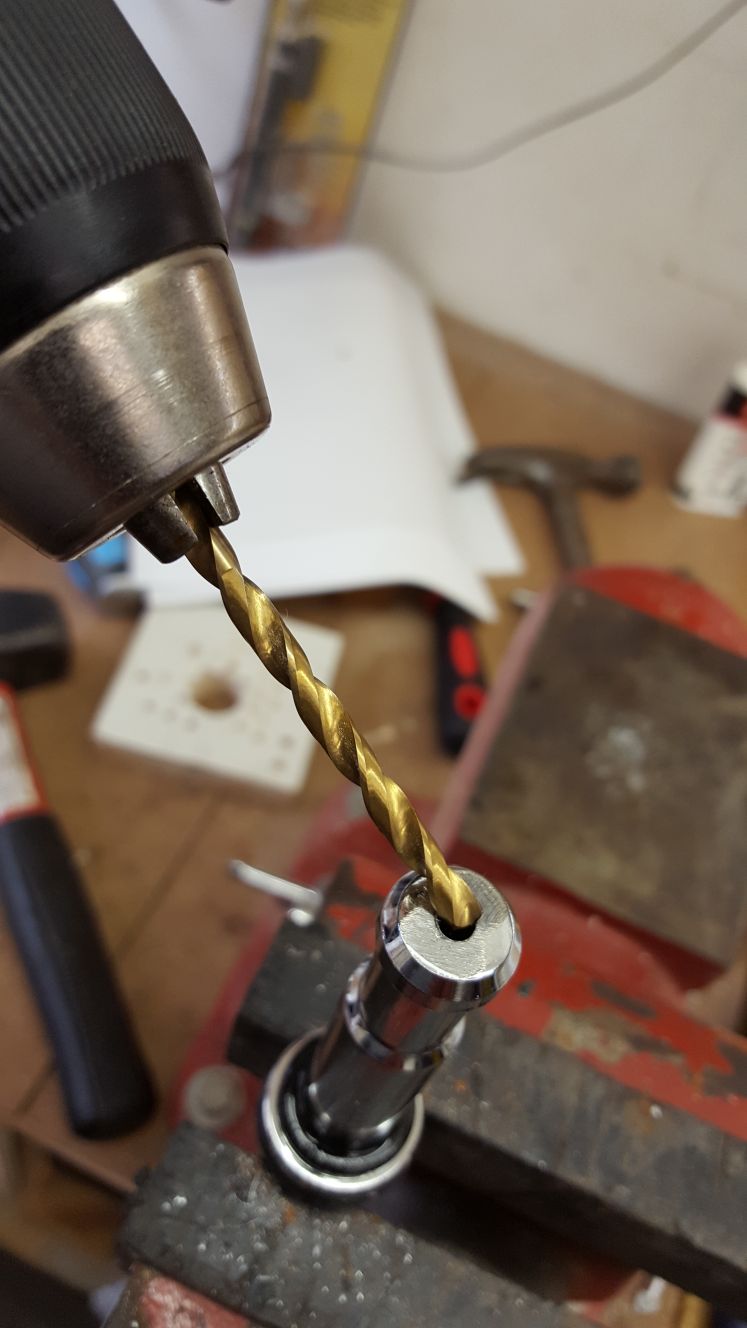Working with my father in his shop. First you have to file off the chrome on the top of the tip. We then used a center punch to create a small dent in the center of the tip for drilling.