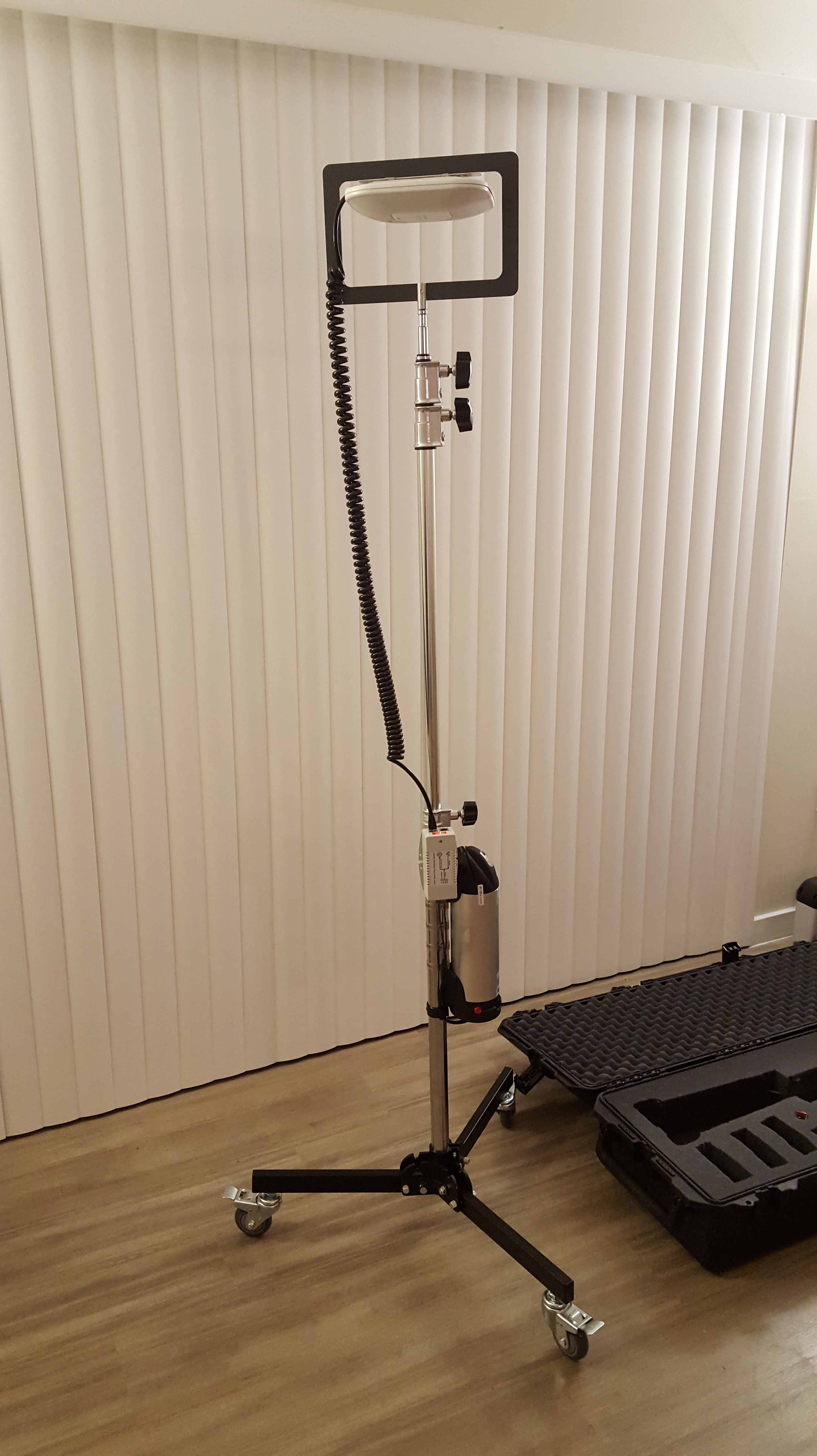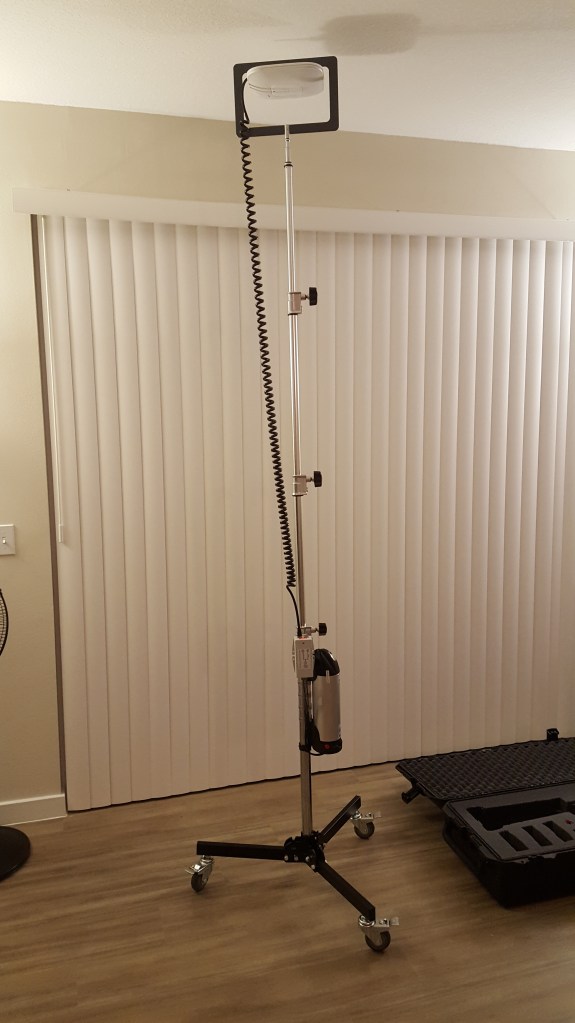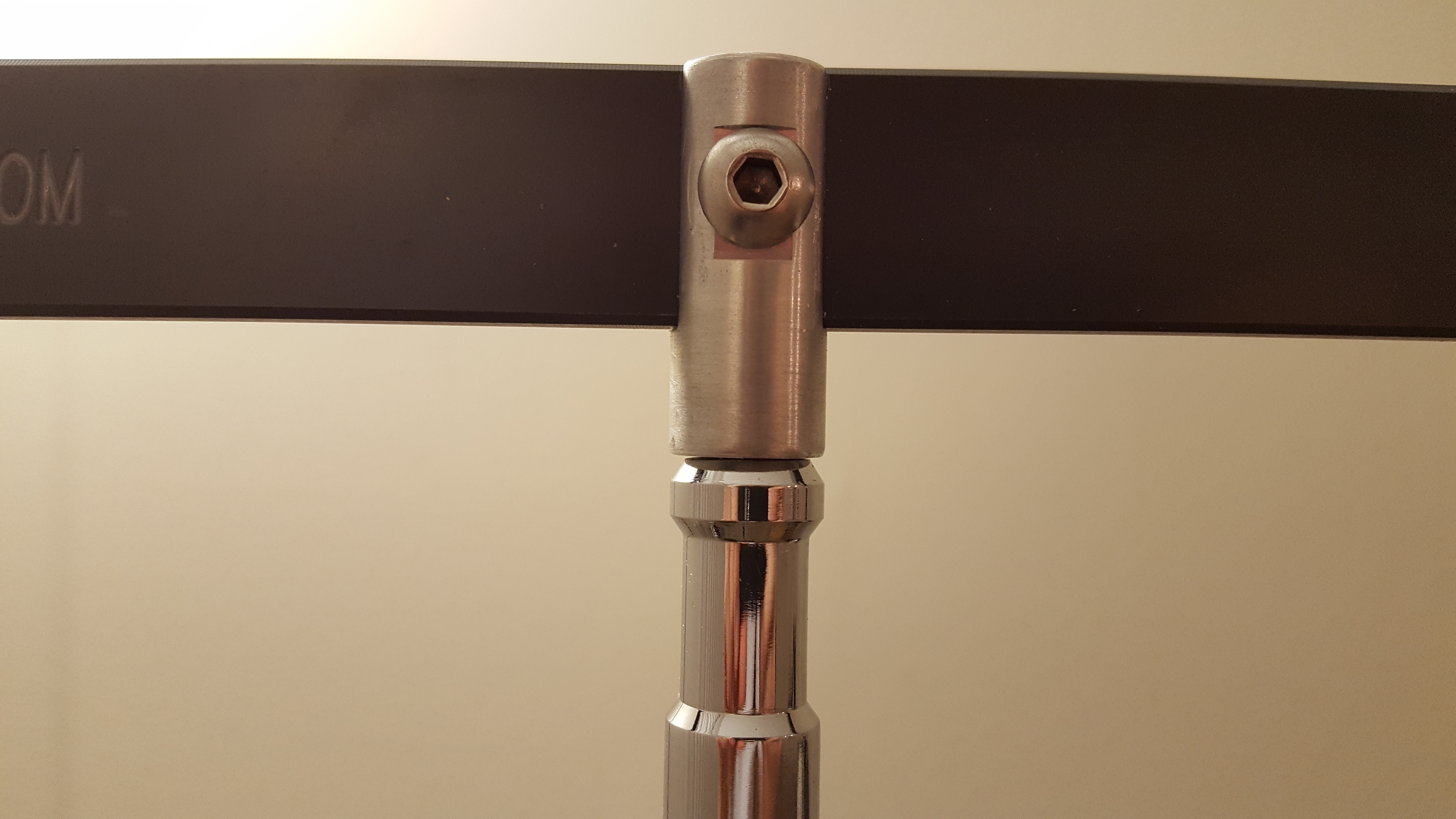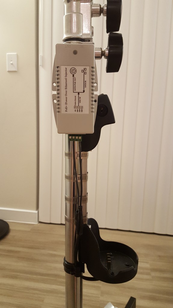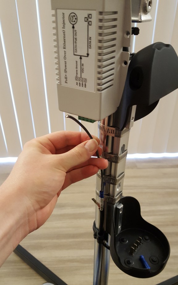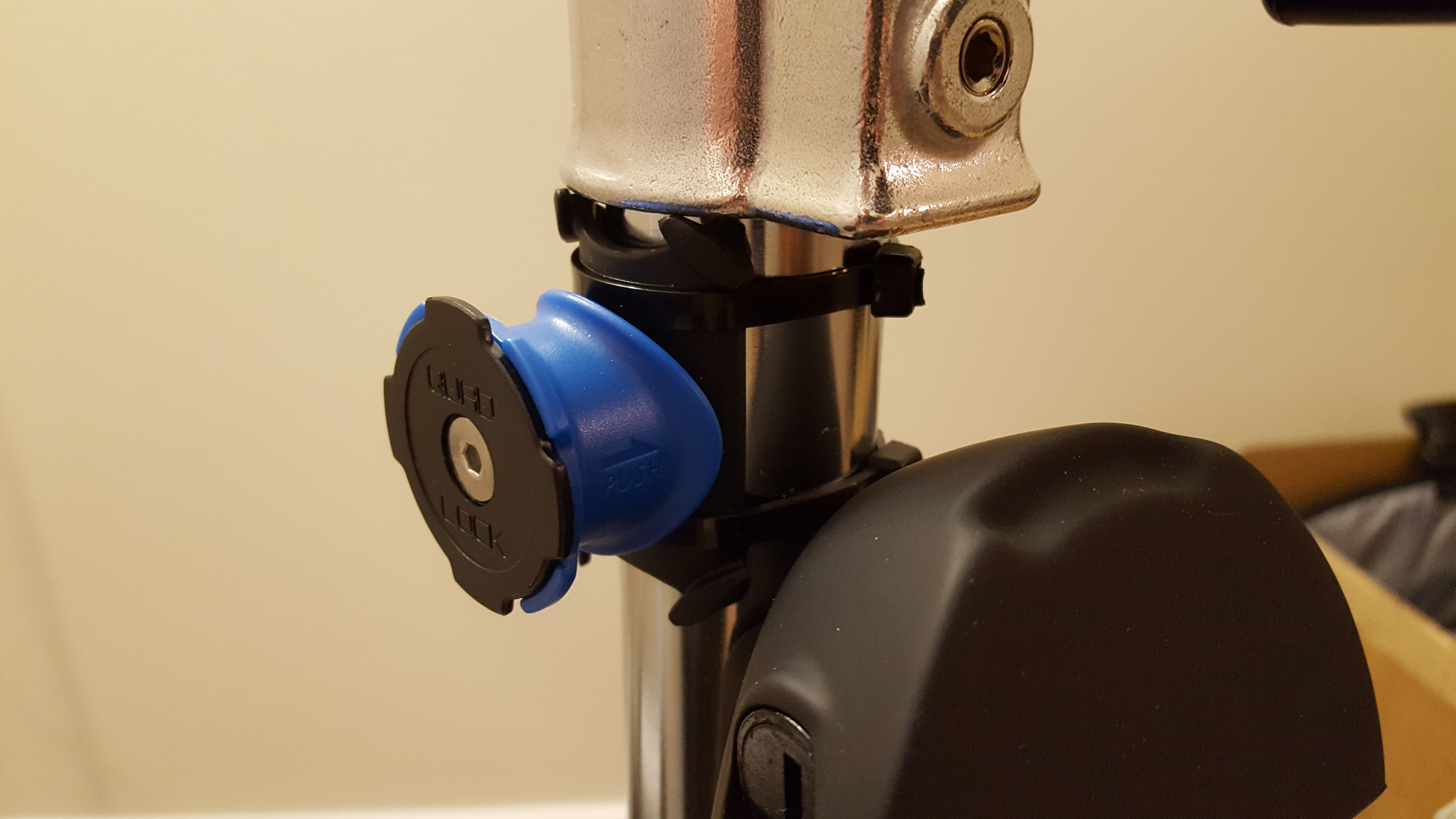 I then connected the Quad-Lock with the supplied zip-ties. I placed it just above the battery, to give it some height from the ground so that the Ethernet cable has a higher starting point. I also placed it under the first knob, so that when the tension from the Ethernet cable pulls up as you raise the height of the stand, the first knob stops it from moving.