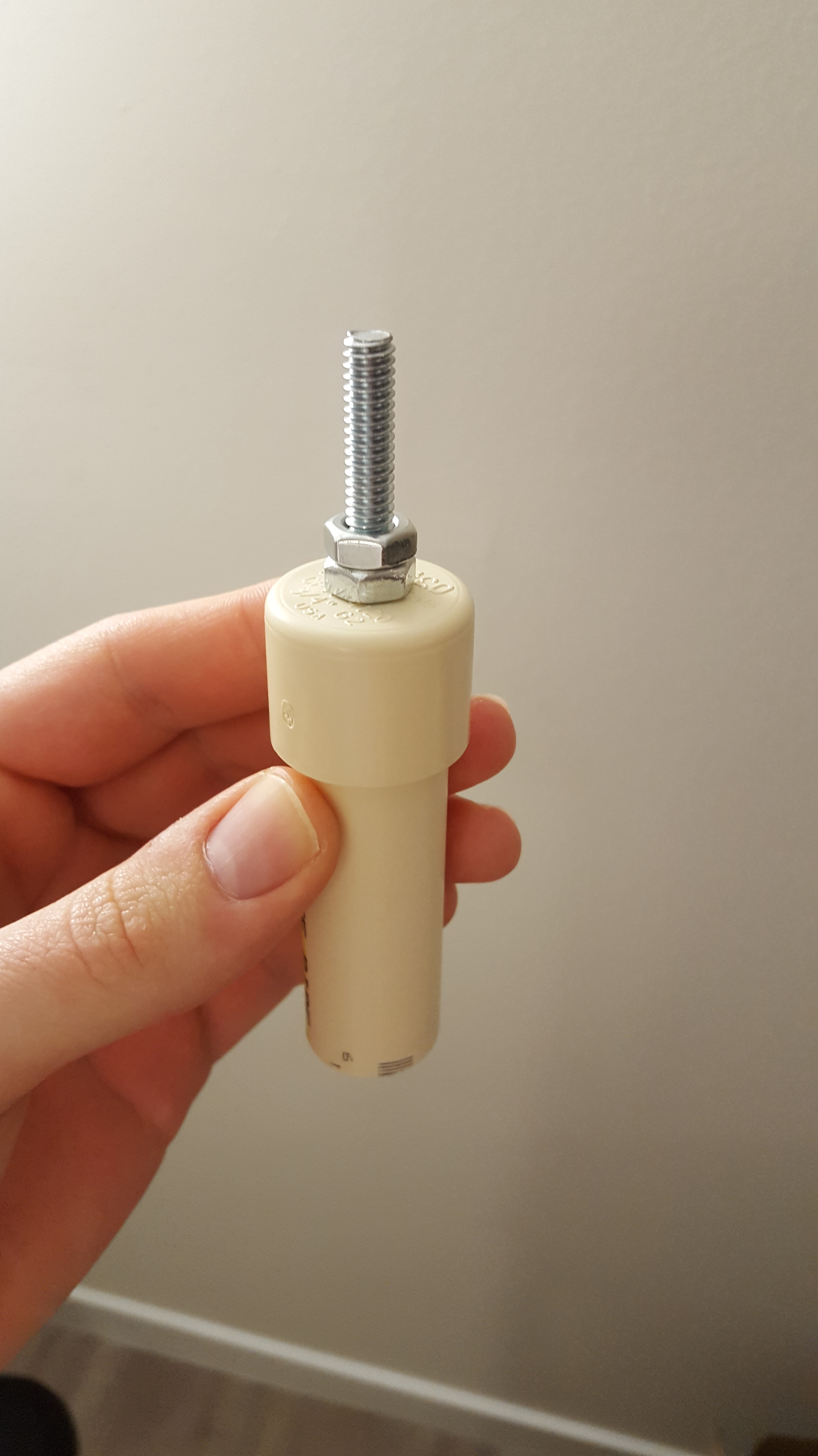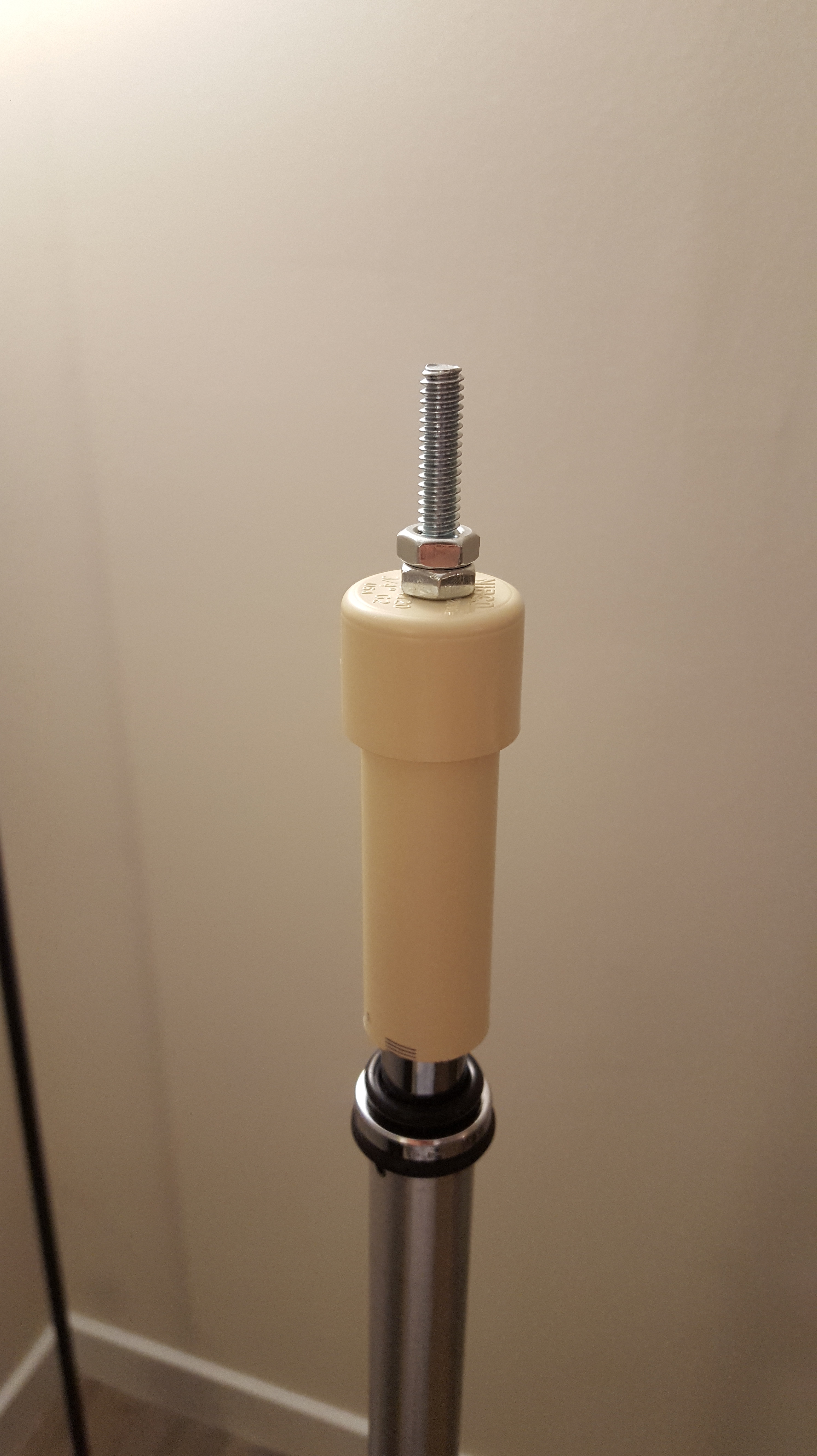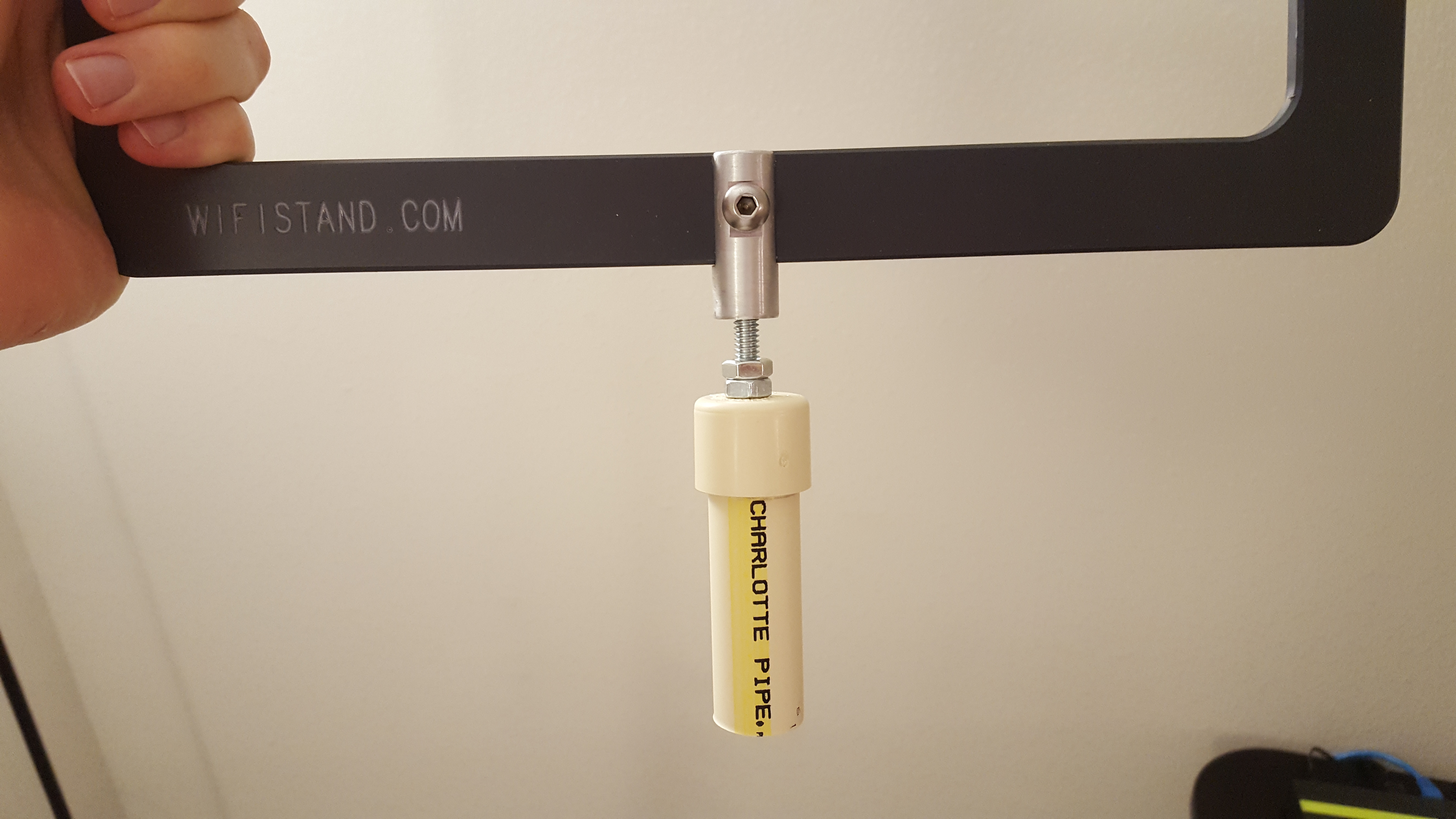 The first thing I needed to figure out how to do, was get the Wi-Fi Stand Bracket to mount to the top of the tripod. The first idea I had (which will work fine for those that don’t have access to tools), was I purchased some PVC pipe (5/8). Cut it about 4 inches in length, and capped it. I drilled a hole into the cap and then inserted a 1/4-20 thread bolt and nut.