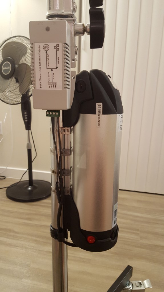 4. Did you run into any issues with the PoE converter and a fully charged battery? The e-bike battery I have is 36V nominal voltage, but when fully charged puts out close to 42V – the 9-36VDC input PoE converter I have can’t handle this and doesn’t provide an output until the battery is slightly discharged 😦